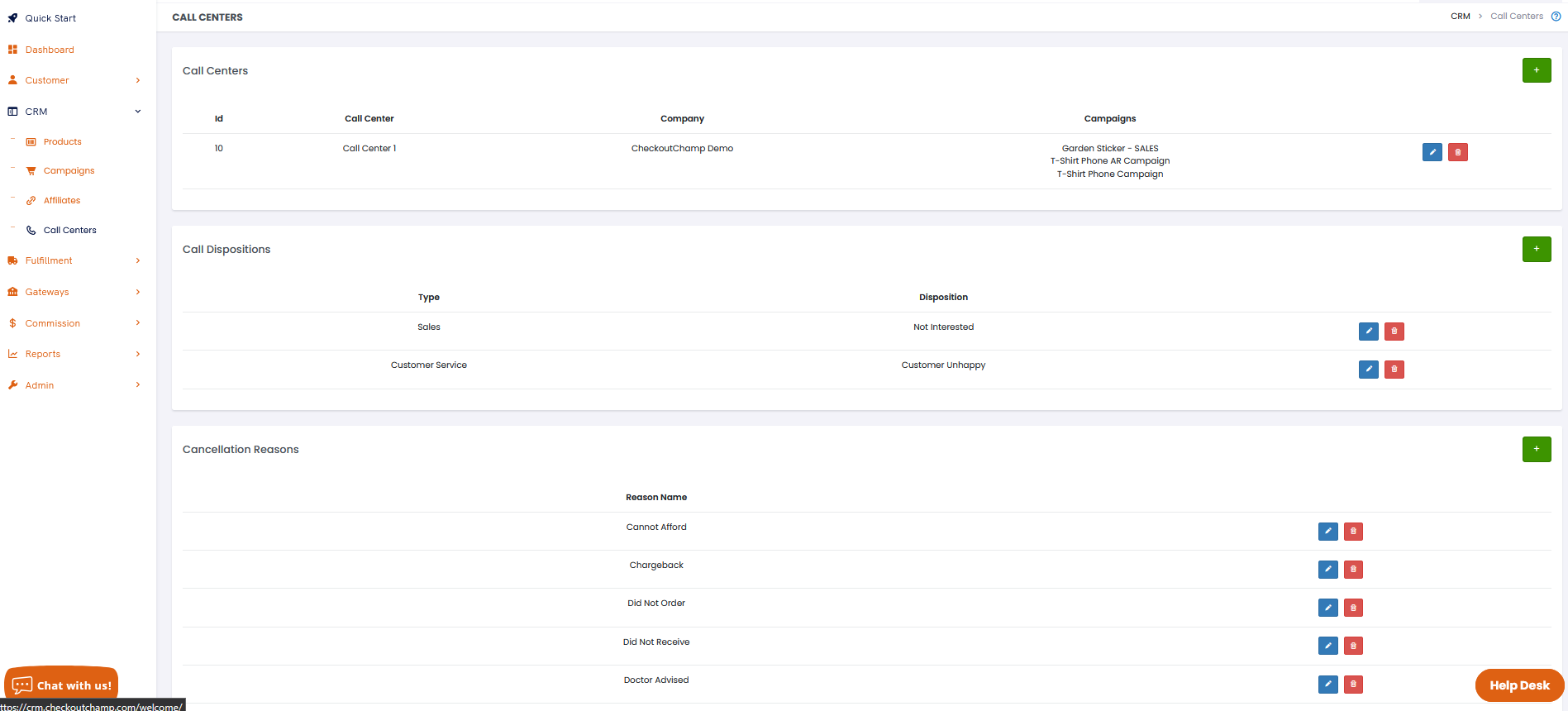 You can configure specific cancellation reasons, refund reasons, and call dispositions under **CRM -> Call Centers.**