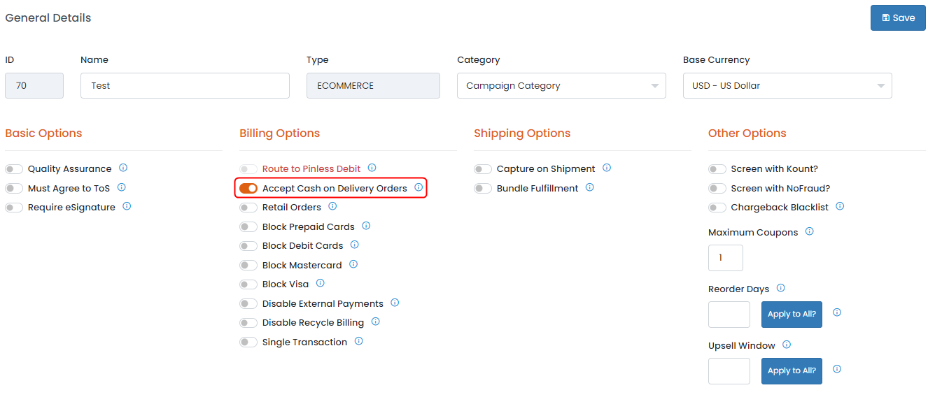 Cash On Delivery option can be enabled within the campaign. When using Cash On Delivery, no payment will process at the time of sale. Instead the order is approved without payment and will send to the fulfillment house plugins automatically. The customer will provide cash to the delivery person upon delivery.