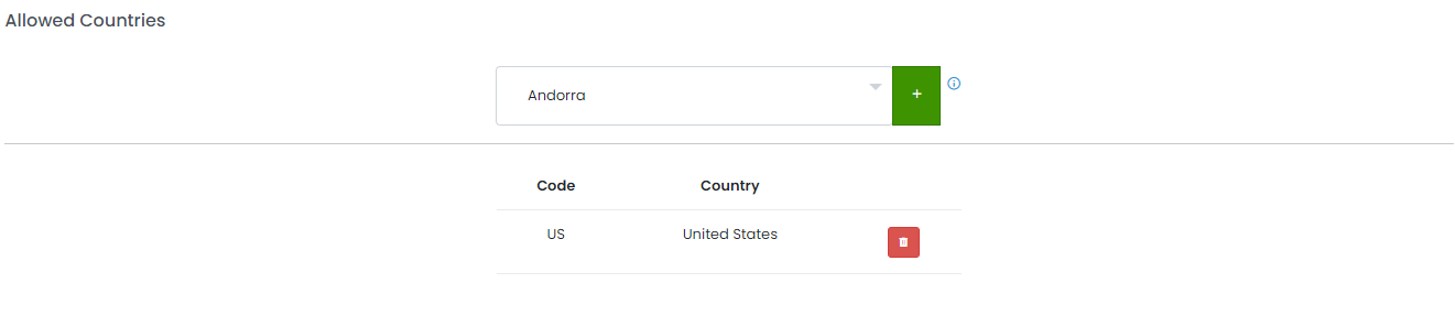 On the left navigation you will see the **Countries** tab where you have the ability to choose where you want to sell your products. Click on **Countries**, then click the **Drop-Down** to choose a country, then click the **green "+" button** to add it.
