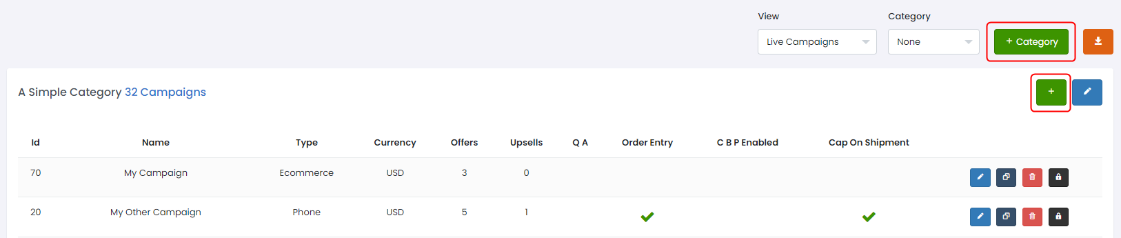 Click on the green **“+” button** to add a new category and then click the smaller green **“+” button** to create a campaign.