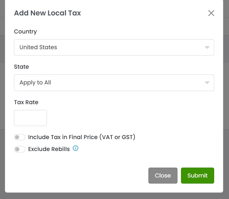 Choose **Country**, **State**, and **Tax Rate**. **Tax Rate** must be entered with decimals (.01 = 1%).