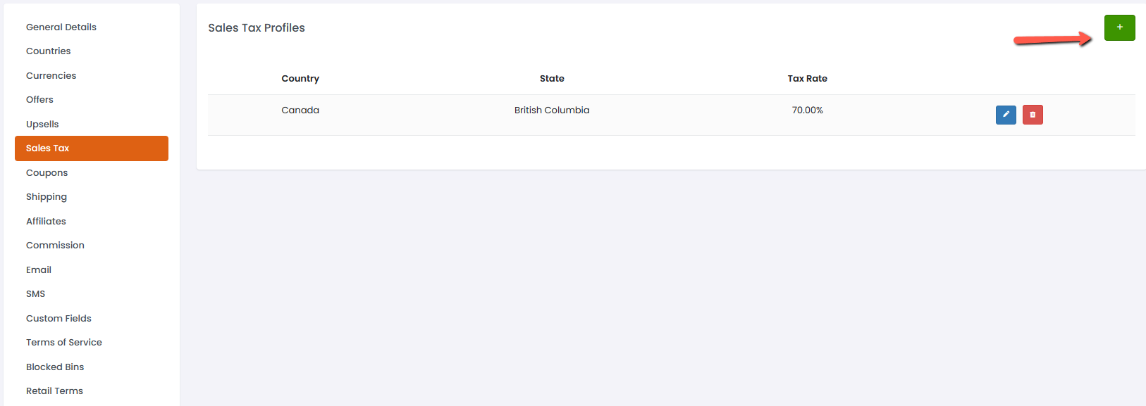 Apply sales tax to specific regions. Click on the green **+ Button**.