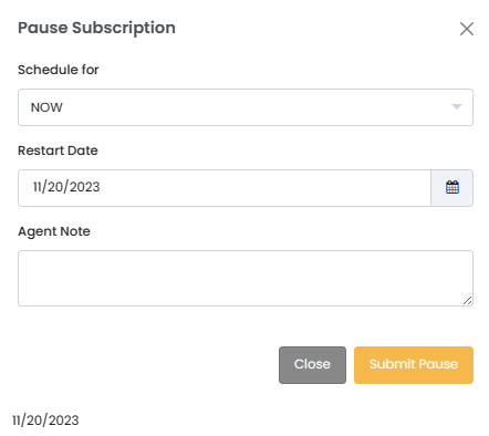 * **Restart Date:** Choose the date that the subscription will reactivate. The subscription will bill on this day.