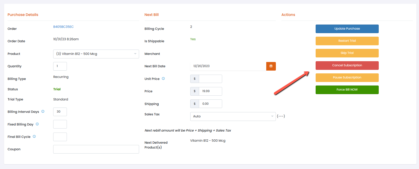 Inside the Purchase Details page *select* the *Red* **Cancel Subscription button.**