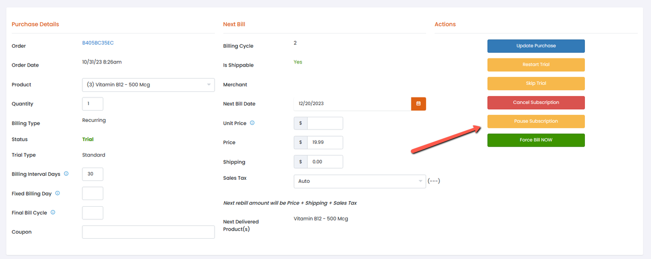 Inside the Purchase Details page *select* the *Yellow* **Pause Subscription button.**