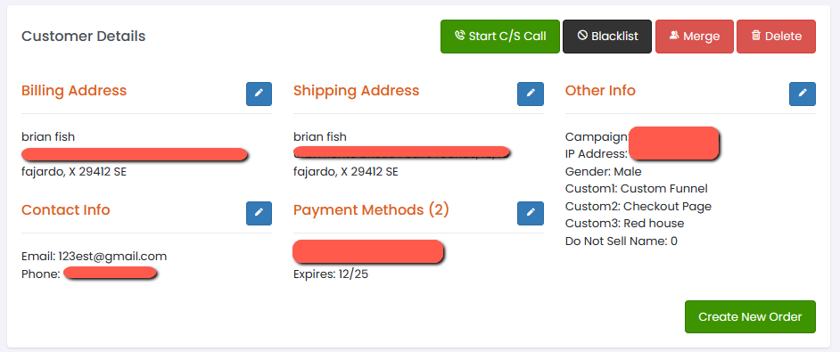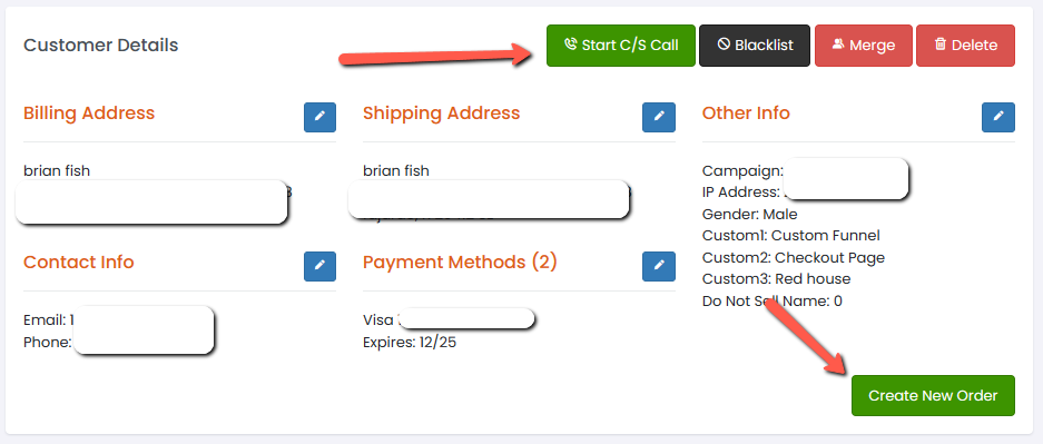 *Select* the *green* **Create New Order button** to start a new order with that customer’s information or *click* the **Start C/S Call button** to call the phone number on record with a [Phone Switch Plugin](https://help.checkoutchamp.com/crm/plugins/phone-switches)