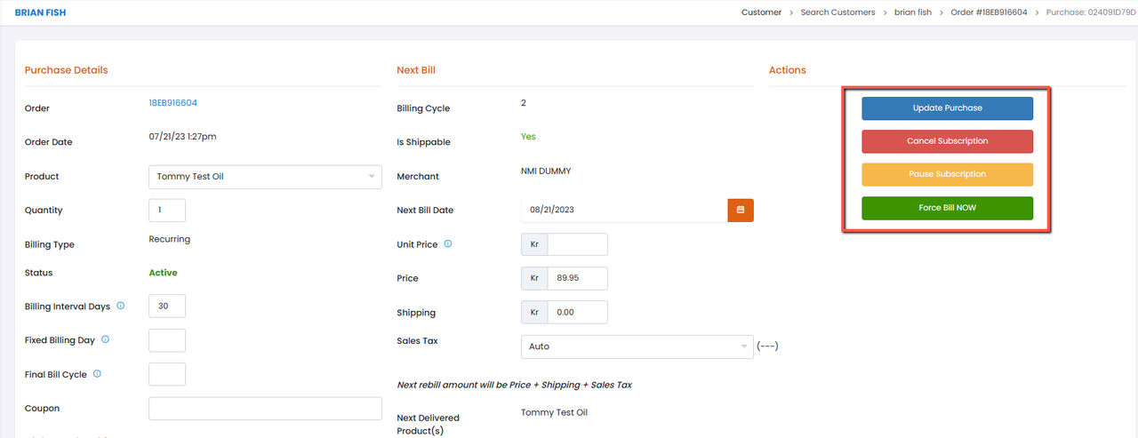 Interact with the customer's purchase by either *clicking* on the **OrderId** or the **Product Name** of a subscription product in the **Orders** section: