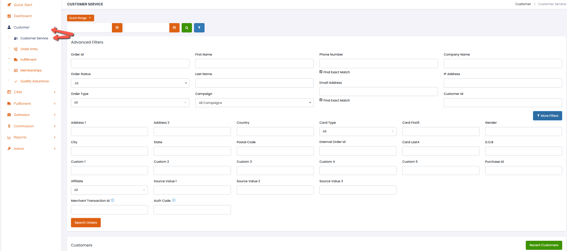 *Navigate* to **Customer** → **Customer Service** to search for customers. Use the *search fields* to locate the Customer or Customers that you are looking for then *click* **Search Orders**