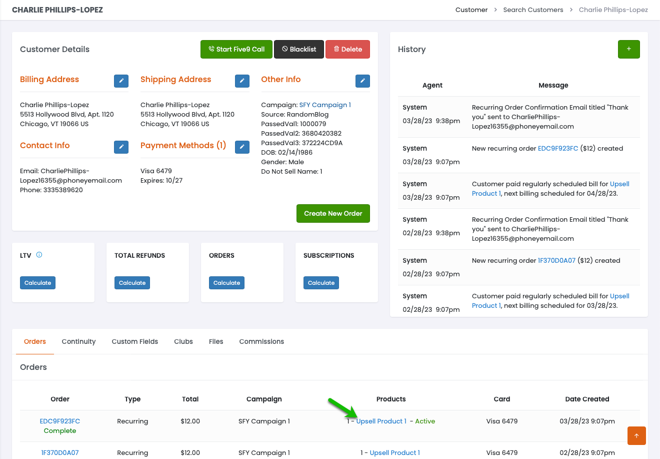 When you find the customer, click on their name to open their Customer Profile and verify that this is the proper customer that you need to bill. Once you are sure, click on the hyperlinked product to bring you to the Purchase Details page for that specific purchase.