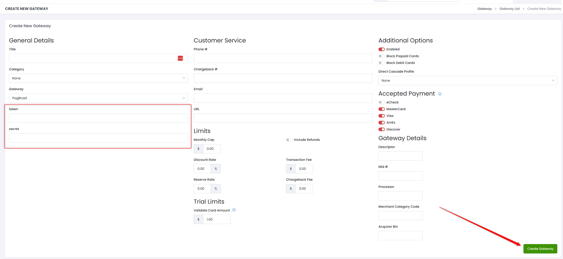 Press the green “Create Gateway” button to create your PagBrasil gateway.
