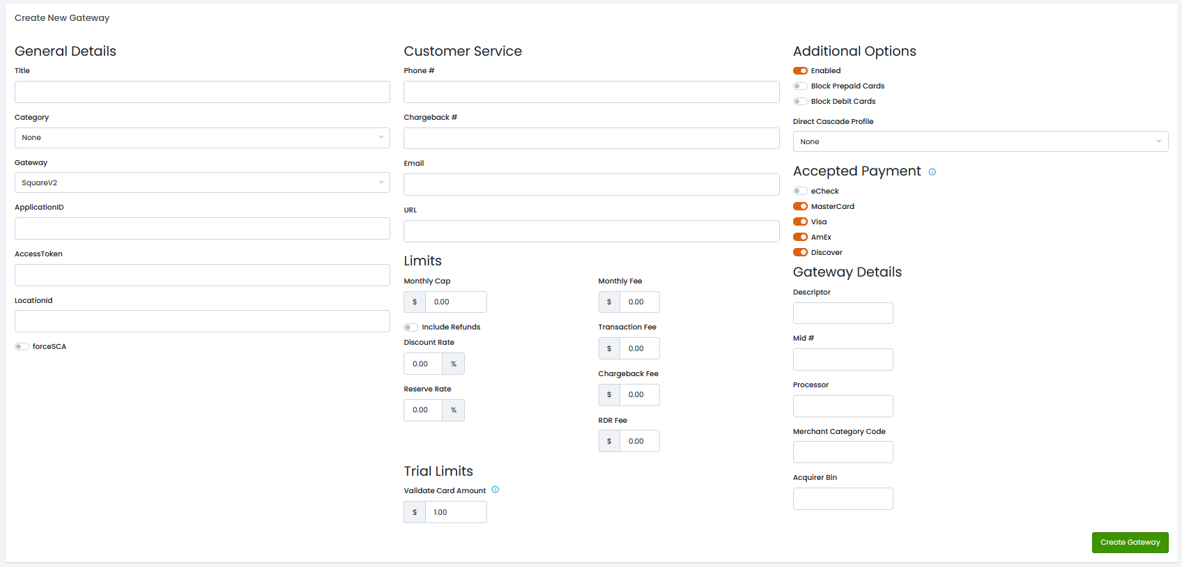 **Step 4**. Enter your **AccessToken** and **LocationId** in the General Details Section of the Create Gateway screen.