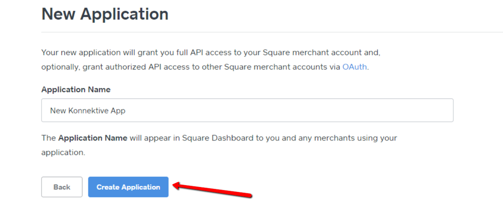 **Step 3. Name** and **Create** your Application, Doing so gives you complete API access for your Square merchant account.