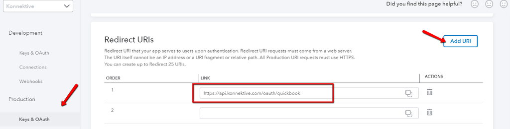 * In the same **Production** Section, Please scroll down to **Redirect URIs** and click **Add URI**. Enter **<https://api.konnektive.com/oauth/quickbook/>**