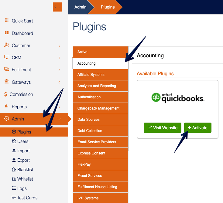 Navigate to **Admin** → **Plugins** → **Accounting**. Select **Quickbooks** and hit the Green **+ button** to add an instance of the plugin.