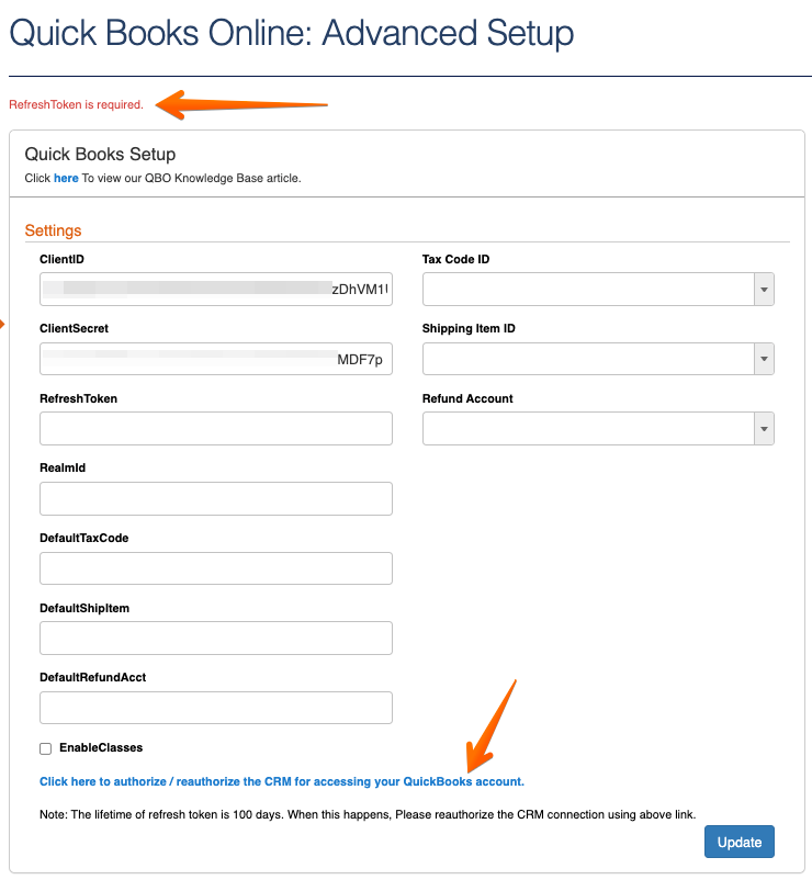 ERROR: Please refresh the page. If this issue persist please reauthorize the CRM for accessing your QuickBooks account. ERROR DETAILS: Refresh OAuth 2 Access token with Refresh Token failed. Body: \[{"error\_description":"Token invalid","error":"invalid\_grant"}].