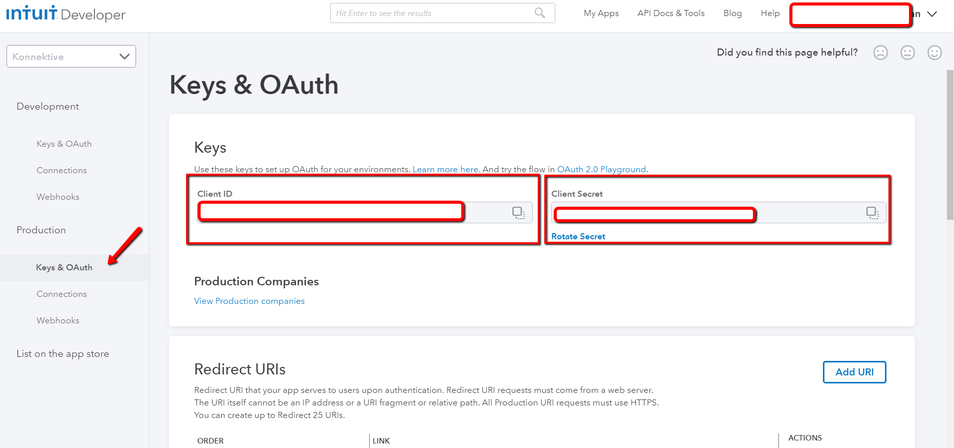 * Navigate to the **Production** section and click on **Keys & OAuth** This will expose your **Client ID** and **Client Secret**