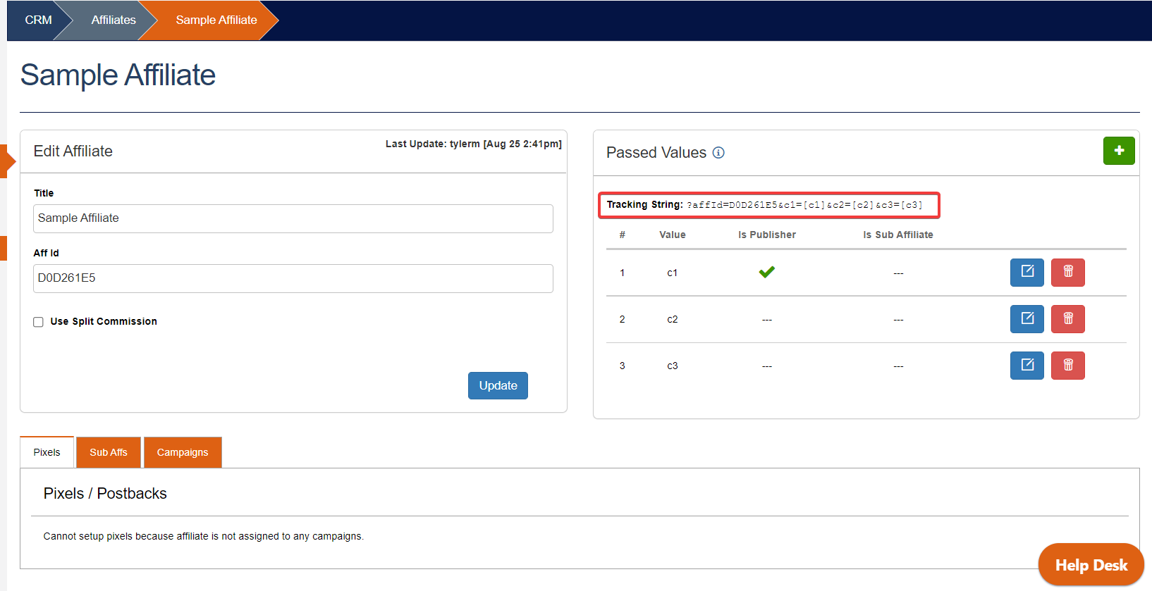 After you have set up a campaign and an affiliate, make sure that the affiliate is added to the campaign. Then, navigate to **CRM > Affiliates**, and click on the **Edit** button for the desired affiliate.