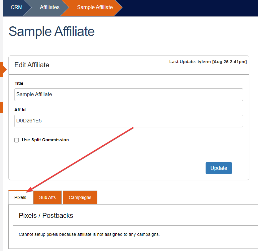 Go back to Checkout Champ and go to **CRM > Affiliates**, and click on the **Edit** button for the desired affiliate. Then, click the **Pixels** tab.