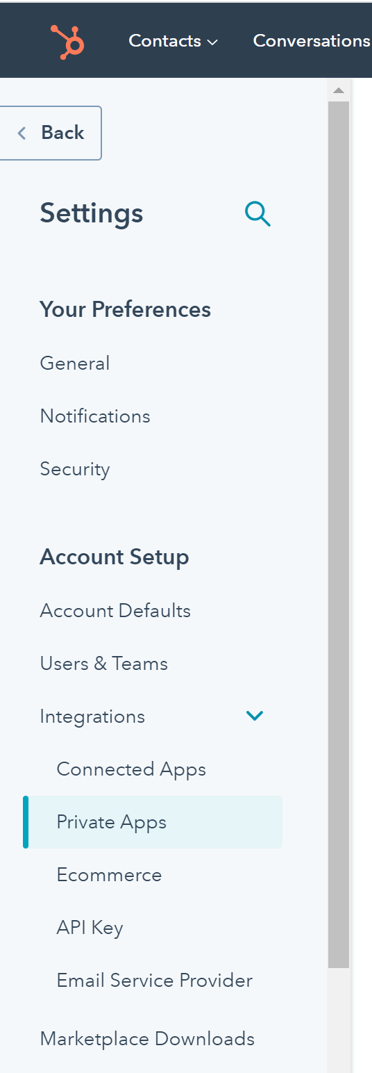 1. On the left navigation bar, expand “Integrations” and click “Private Apps”