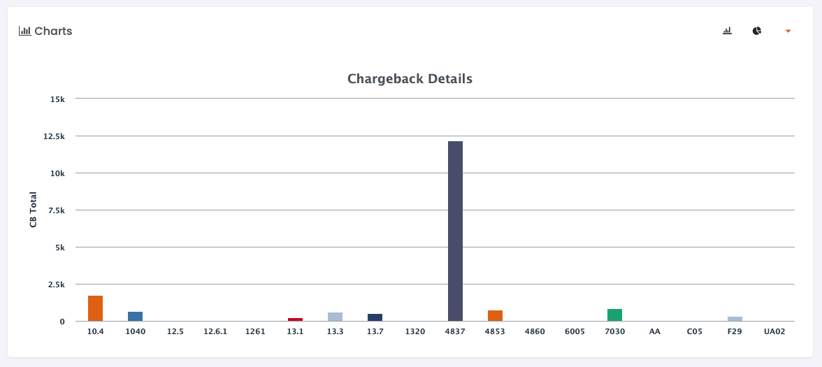 The charts provide a visual representation for the Chargeback Reason Codes being displayed on the table below. You may select to view the chart as a bar graph or pie chart.