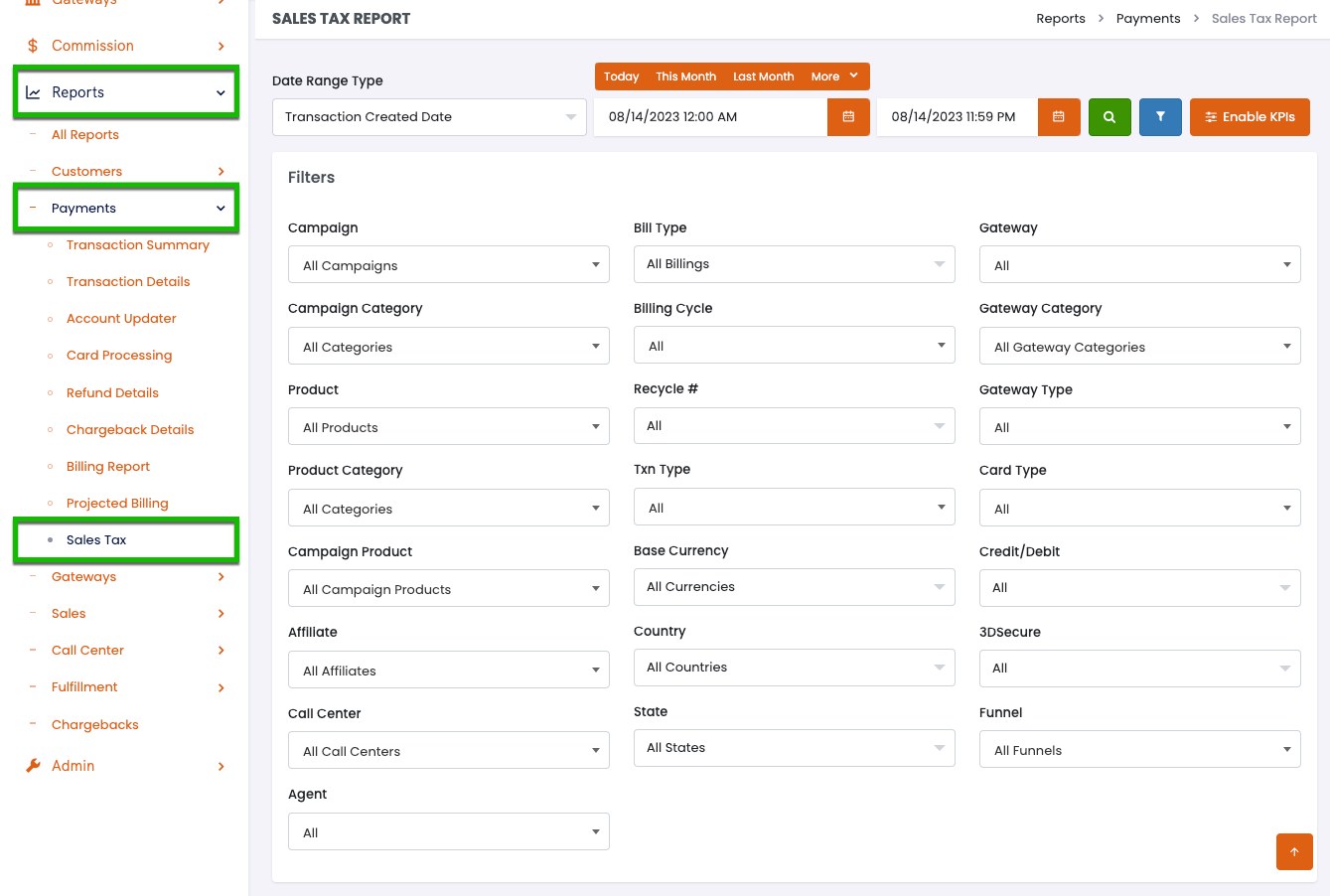 * **Call Center** : Filter for transactions associated with a specific call center.