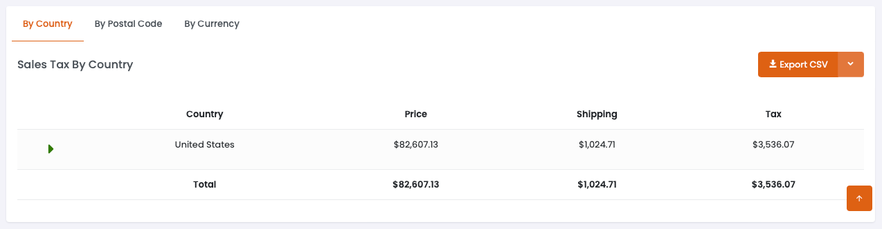 The data table can be viewed **By Country,** **By Postal Code**, or **By Currency**.