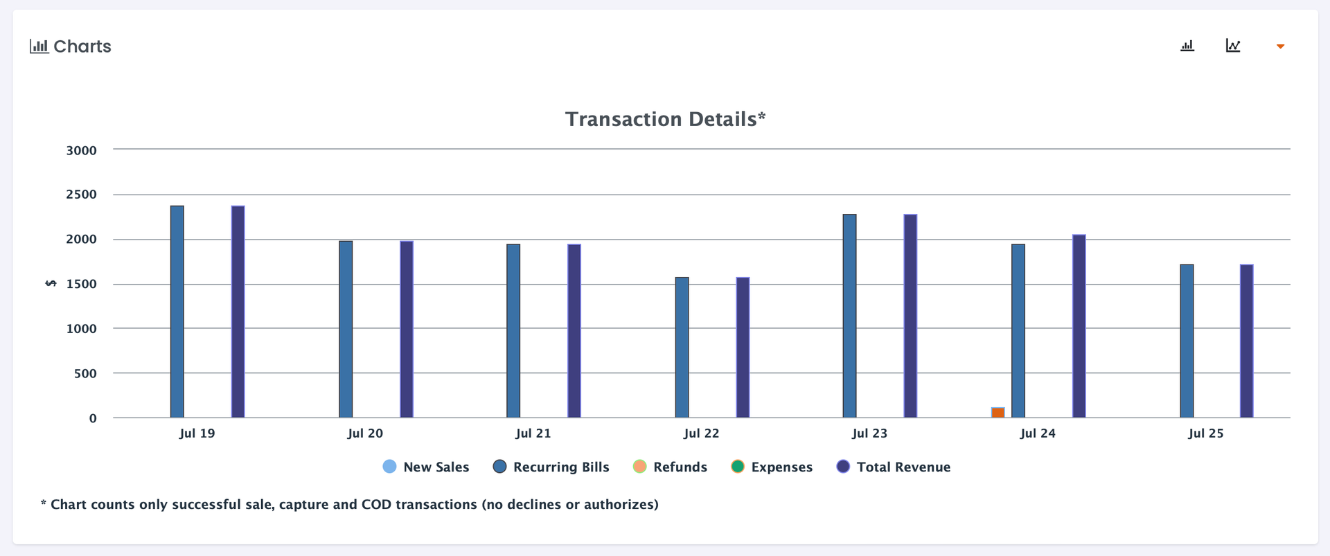 The charts provide a visual representation for the New Sales, Recurring Bills, Refunds, Expenses, and Total Revenue for the transactions being displayed on the table below. You may select to view the chart as a bar graph or line graph.