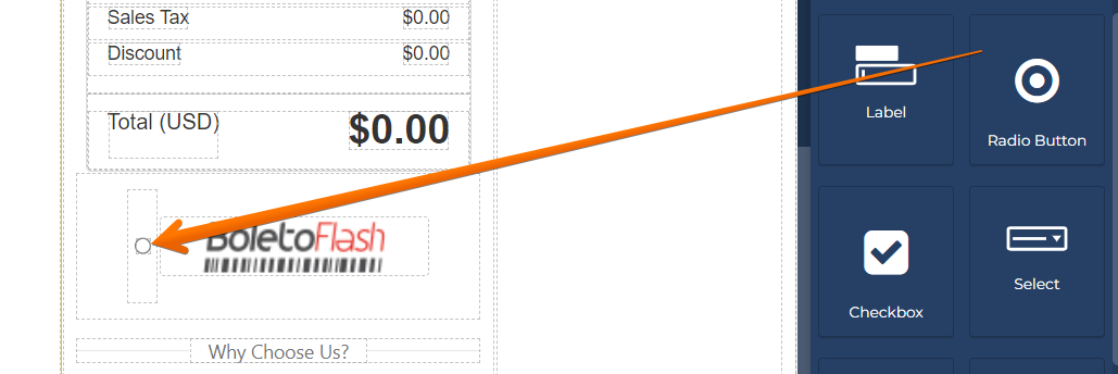 #### Step 6-1(radio): Add a radio button to the page. You may design this to your preference. <a href="#boleto-checkoutchamp-step6-1-radio-addaradiobuttontothepage.youmaydesignthistoyourpreference" id="boleto-checkoutchamp-step6-1-radio-addaradiobuttontothepage.youmaydesignthistoyourpreference"></a>