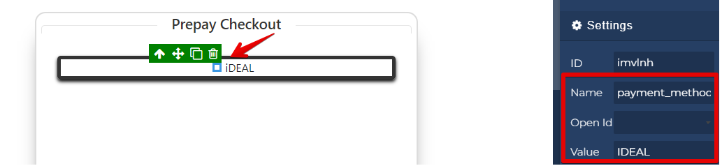 #### Step 6-2(radio): Select the radio button and change the settings so the Name is “payment\_method”. This may also be used with the payment toggler by setting the name to “fk-payment-option-toggler“. Then set the Value of the radio button to the name of the pay source in all caps. <a href="#ideal-checkoutchamp-step6-2-radio-selecttheradiobuttonandchangethesettingssothenameis-payment_method" id="ideal-checkoutchamp-step6-2-radio-selecttheradiobuttonandchangethesettingssothenameis-payment_method"></a>