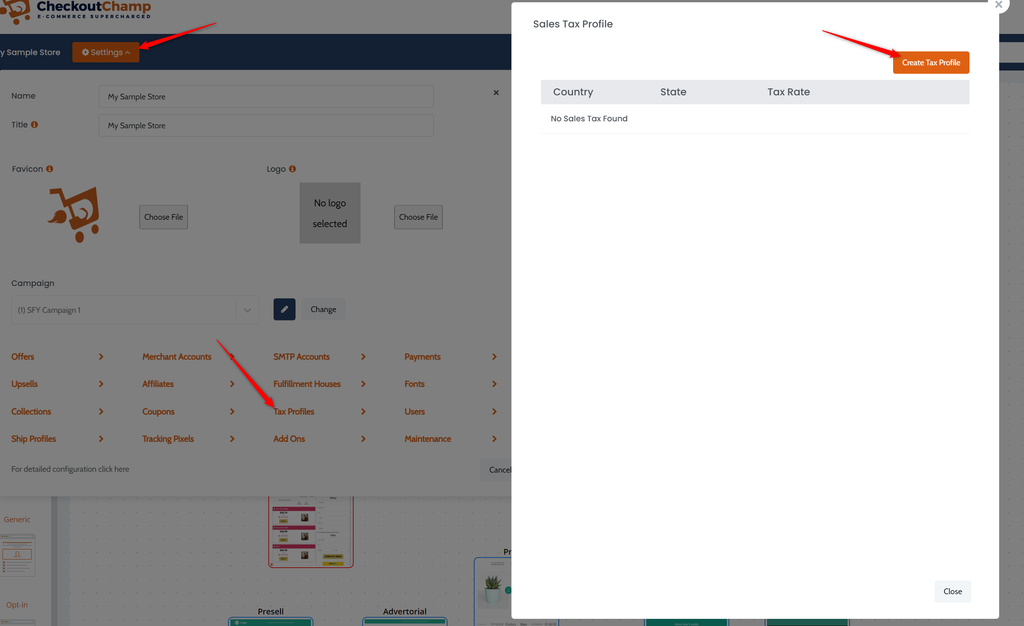 To charge tax on a funnel/campaign, go to the funnel Settings and open the Tax Profiles section.