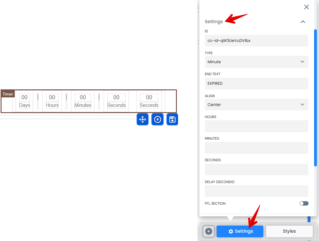 To configure the Timer itself, click on the space to the far left or right within the element that highlights the entire Timer element. Then open the element’s settings inside the [Style Manager](https://help.checkoutchamp.com/funnel-builder/creating-and-editing-funnels-pages/funnel-visualizer-and-page-builder/page-builder-2.0/settings-and-style-manager) to configure the Timer.