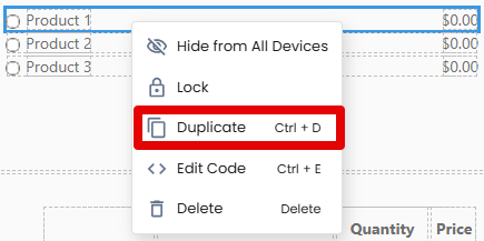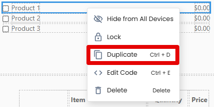 Dragging this Block onto the page will add three product tiles with radio buttons to the page. You can remove the extra tiles if you don’t need them, or if you need more you can simply duplicate one of the existing ones using the button highlighted below.