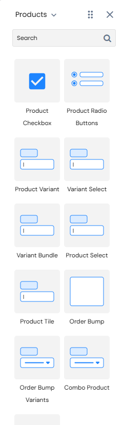 Inside the Products menu within the Building Blocks you have several options to choose from to add to your pages.\
