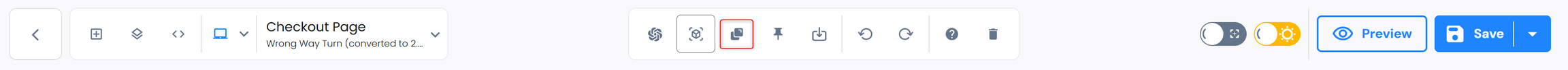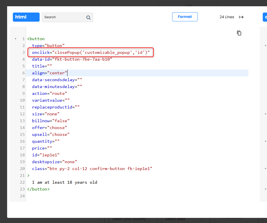 * One button will close the popup to enter the site. Set the button Action=Route To Next Page. Open the code editor and find the button. Set onclick="closePopup('customizable\_popup','id')". Save.