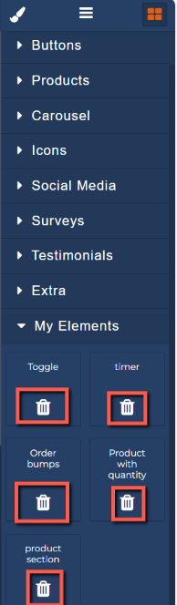 To remove a saved element, open the My Elements section and then click the trash can icon on the element you’d like to remove.
