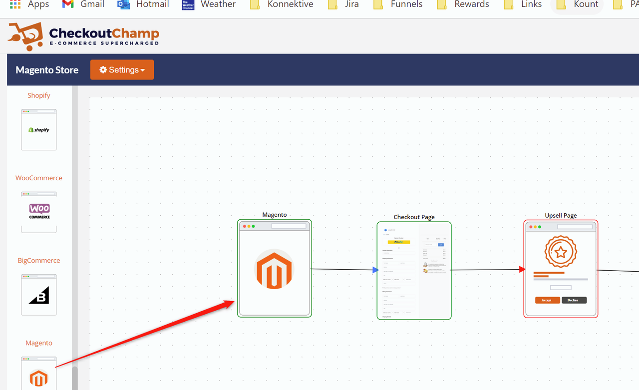 Login to the CheckoutChamp page builder. Navigate to your funnel and drag the Magento page type to the funnel canvas if you have not done so already.